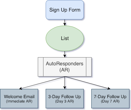 You can also attach several AutoResponder messages to the same list to achieve a fully automated Drip-Campaign. ReachMail's AutoResponders let you quickly create drip campaigns. Fully customizable, you can attach as many or as few AutoResponder messages as you need. The digram to the left (above if you're on a mobile device) shows a basic workflow of a 3 part Drip Campaign series. |