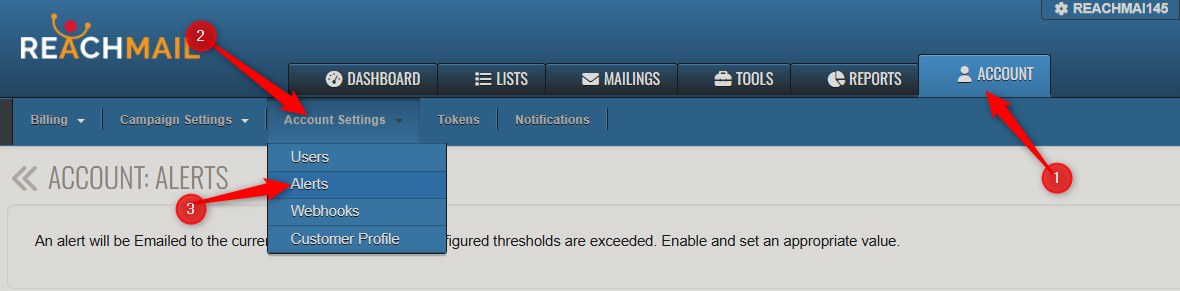 Account alerts provide a simple, configurable way to keep tabs on mailing progress. Account alerts track soft bounces, hard bounces, opt-outs, and abuse complaints and will notify you via email if any mailing crosses your defined threshold for any of those parameters. To configure account alerts: