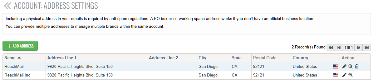 These compliance addresses will be inserted into the footer of all outbound mails as part of your accounts required compliance with all CAN-SPAM rules.