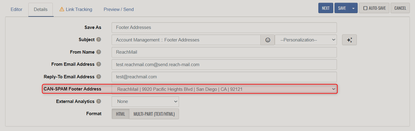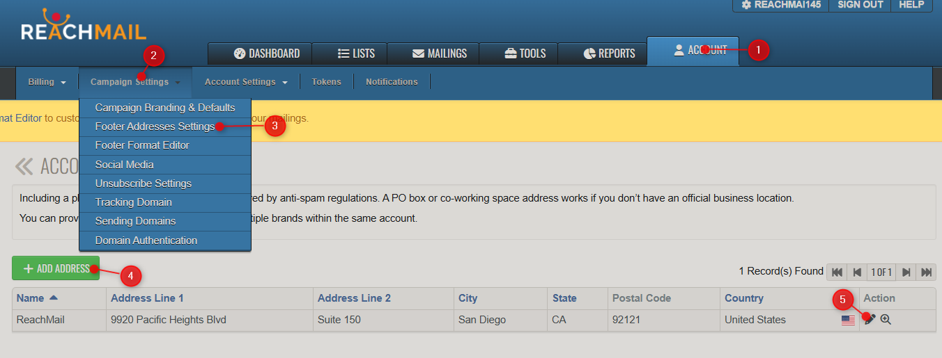 These compliance addresses will be inserted into the footer of all outbound mails as part of your accounts required compliance with all CAN-SPAM rules. To add or edit addresses: