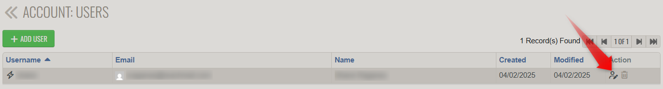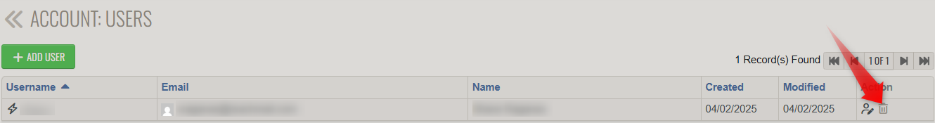 Locate the user you want to edit in the table of users and click the trash can icon.