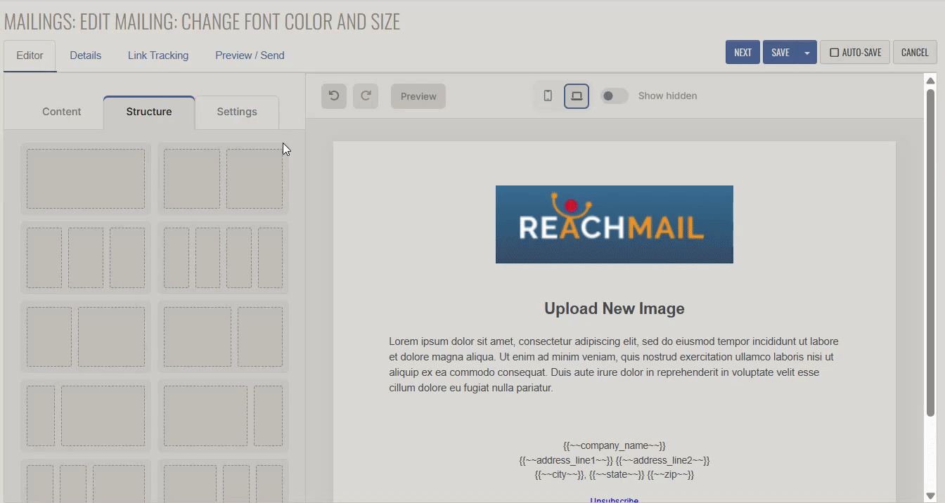 Directions on how to change the font color or size in your mailing in ReachMail's Advanced Editor.