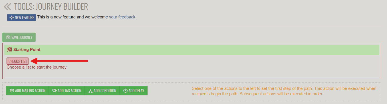 Mailing - Send a Mailing - you can select the mailing for the next step in the journey. Once you select the SELECT MESSAGE button, a popup will display all your mailings so you can select the perfect message for this part of your journey.