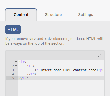 You can insert your HTML code into each template. However, we advise this feature for experts only, as functionality isn't assured once you add your code. Specifically, scripts will not function in client mailboxes due to frequent security concerns and prohibitions on potentially harmful content. Thus, we strongly recommend against inserting any scripts, as it could harm your domain.
