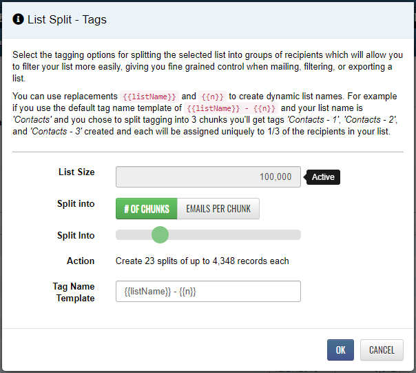The List Split tool allows you to virtually split up your list by assigning tags to chunks of emails. This is perfect when wanting to stagger delivery to a list, have a more advanced A/B testing process, or combine list split tags with demographic tags for some advanced implementations.