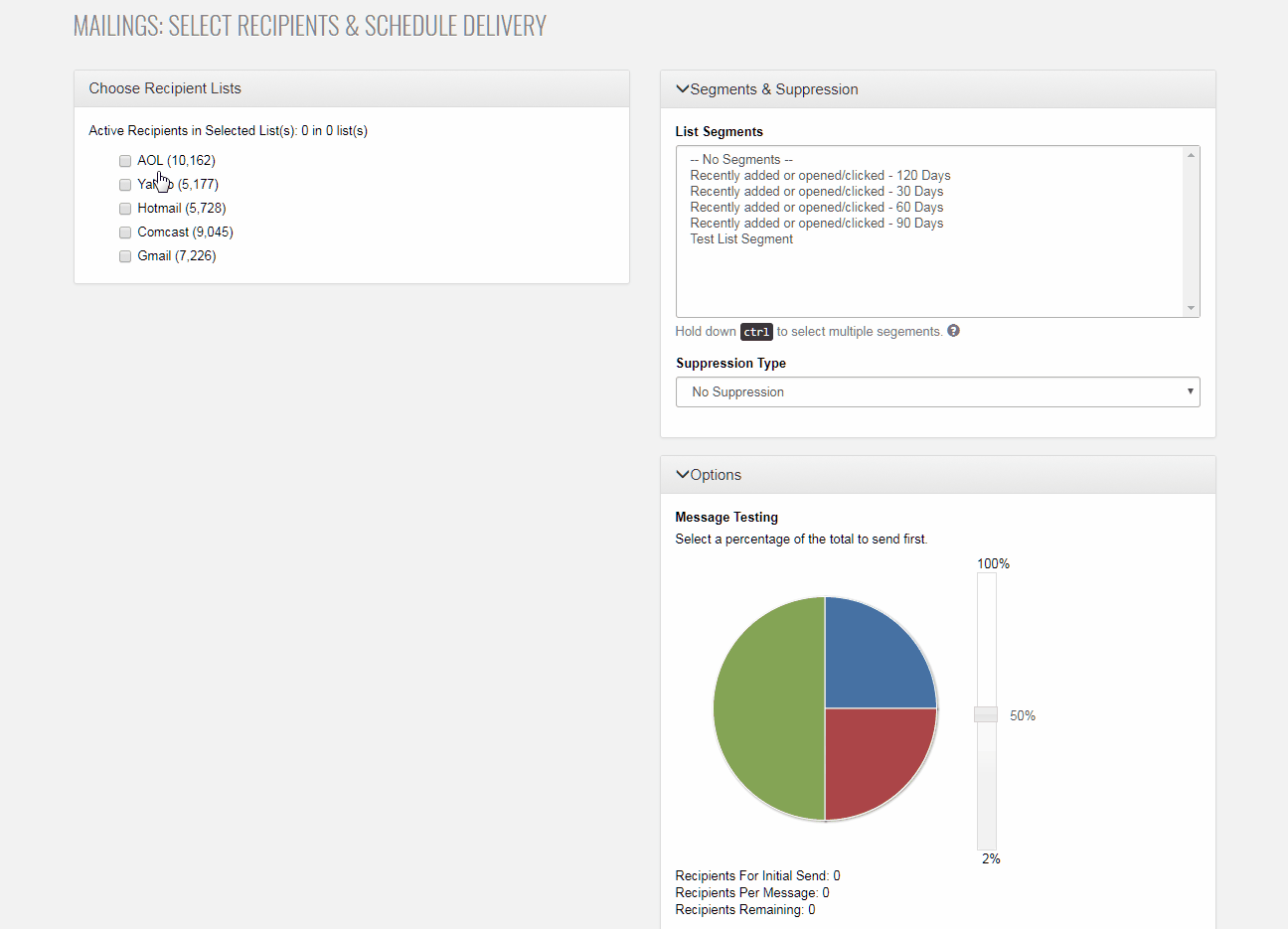 You will be taken to the Schedule Mailing page, except now, you will see a sliding bar on the right side that allows you to select the percentage of your list you would like to test. The message tests will be sent to the test portion you’ve selected.