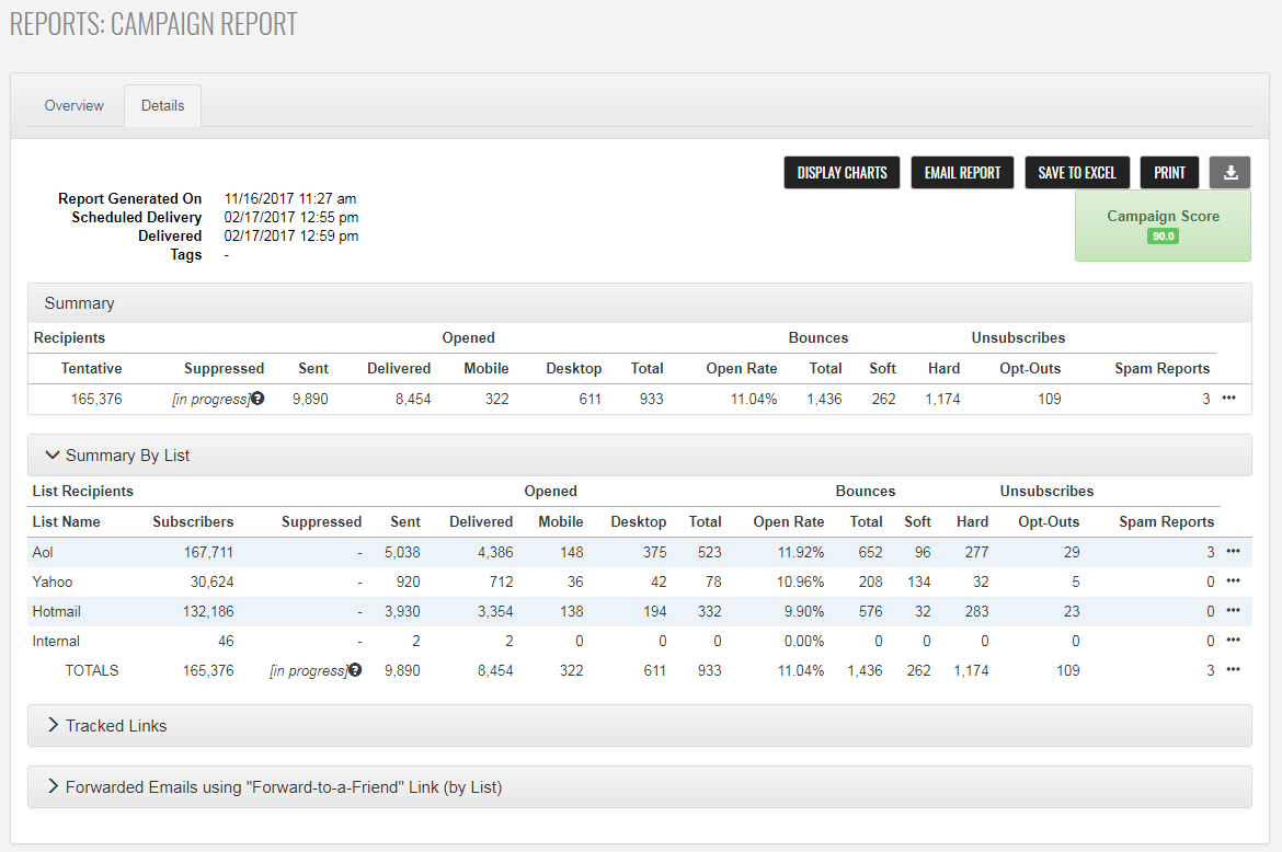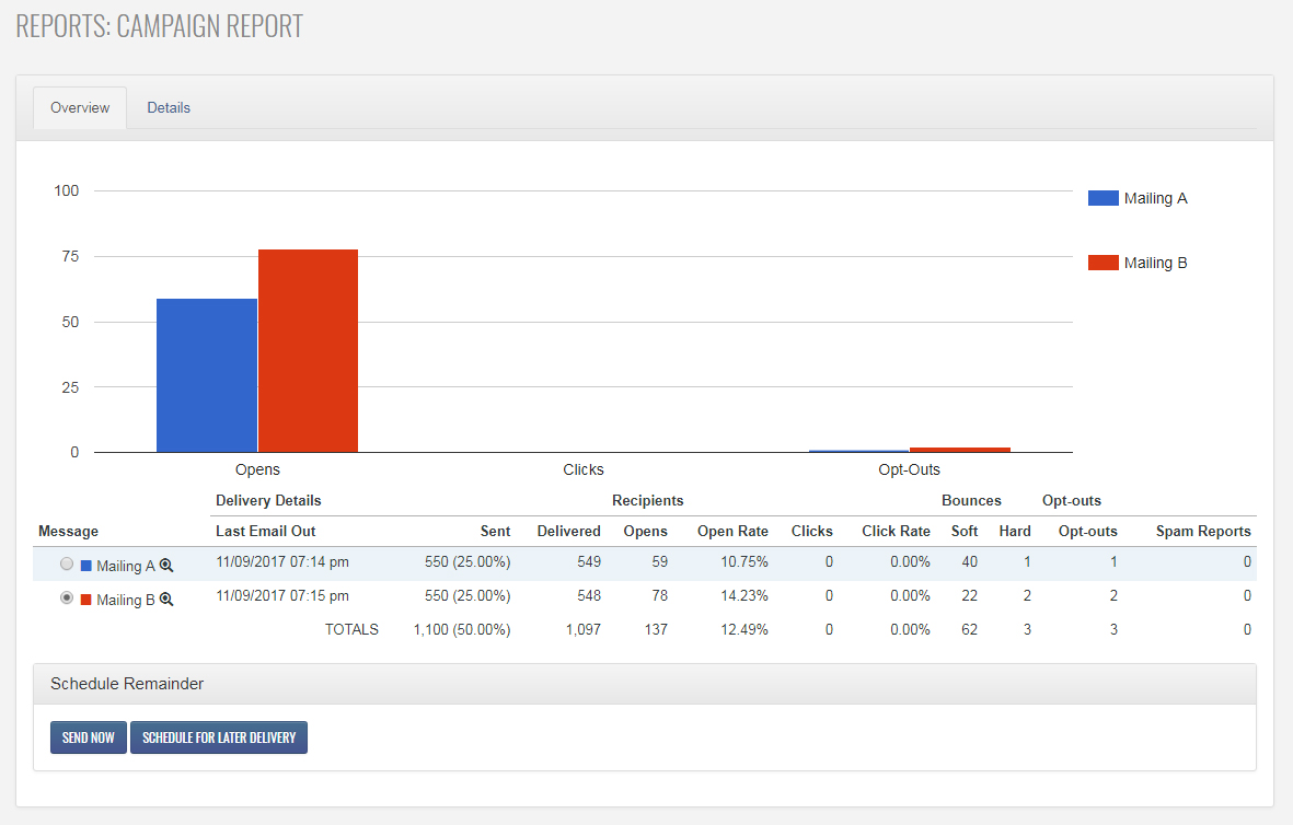 We recommend waiting 24 hours to get an accurate picture of which mailing(s) performed the best. To find out go the Reports tab. Select Individual Mailings, select the message and run the report. The report displays the delivery statistics for each mailing side by side, allowing you to select which mailing you would like to use for the rest of your list. From here, simply select the message you would like to complete the campaign with and click Send Now in the Schedule Remainder section.