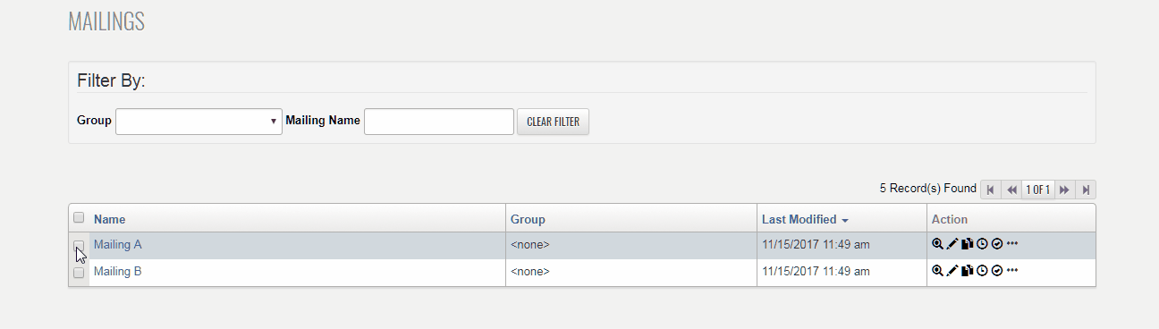 To get started go to the Mailings tab, Create between one to five mailings, or use existing ones, check their respective check-boxes and click the ‘A/B Testing’ button.