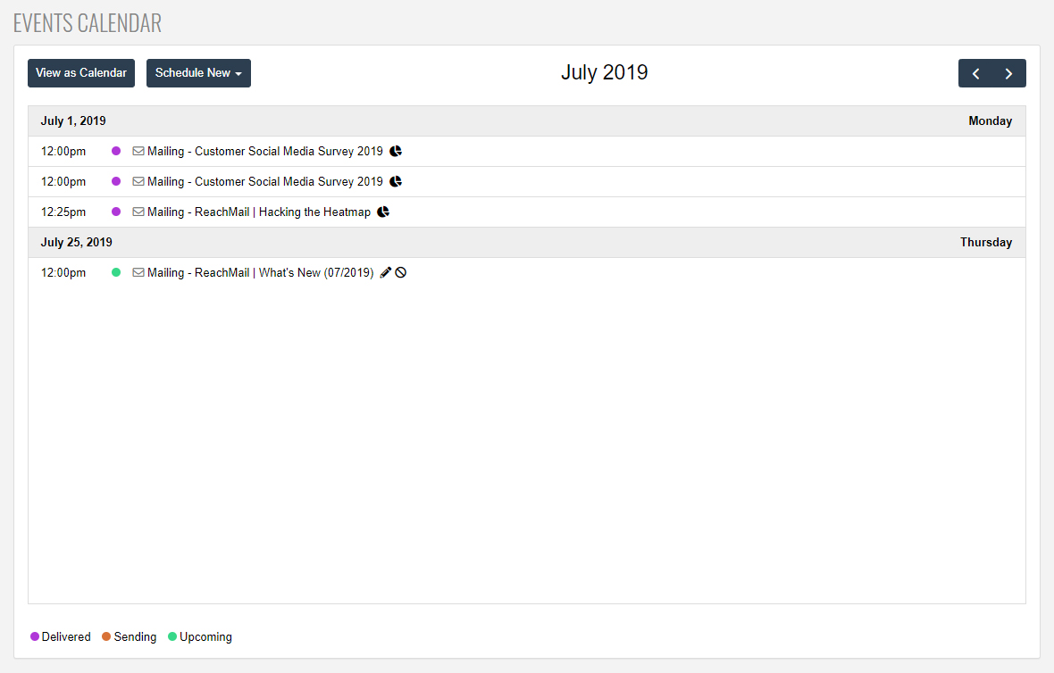 To access the Calendar view simply go to your Mailings tab and then select the Calendar option. From here you'll be brought to a new screen which will, by default, show you a list view of all the campaigns you have delivered, currently mailing, and scheduled within the current month. On delivered campaigns you can click on the graph icon to view the detailed report of that campaign. On scheduled campaigns you can click the pencil icon to edit the campaign or the circle-backslash icon to terminate the campaign.