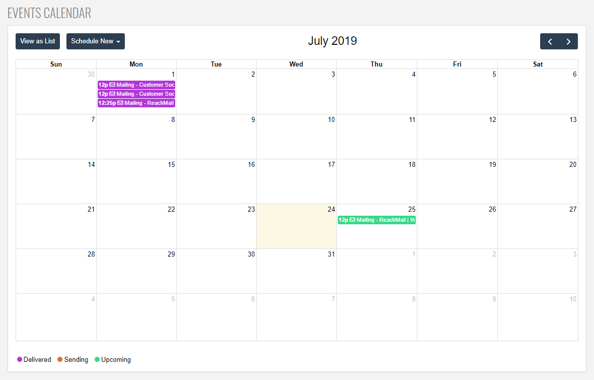 Clicking on View as Calendar will give you a different layout for the information that can help you see what day you're currently on and when you've scheduled campaigns throughout the month. This can be a helpful view to better process how often campaigns are being delivered and when campaigns are normally delivered so you can keep a consistent pattern for your mailstream. Campaigns that have been delivered are in purple, campaigns that are currently sending are in orange, and upcoming campaigns are in green.