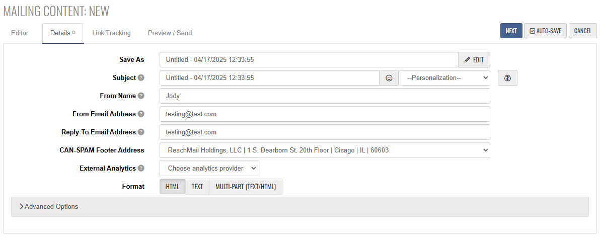 Save As: The mailing name, this will be visible in the list of Mailings in your account.