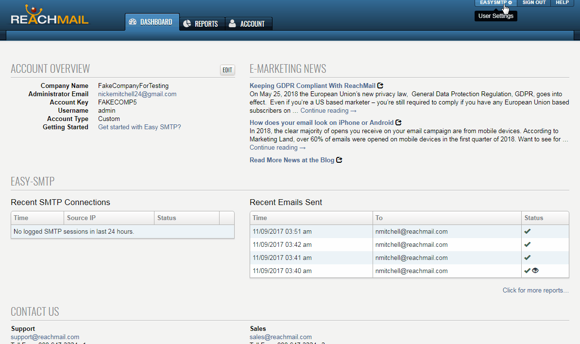 To enable open and link tracking on all messages being sent via Easy-SMTP, simply navigate to the upper right hand corner, and click on your User Settings. This is represented by your Account Key along with a cog wheel icon. Once you've clicked here you'll be taking to your User Settings page. Navigate to the section titled Easy-SMTP and checkĀ Enable Open and Click Tracking.
